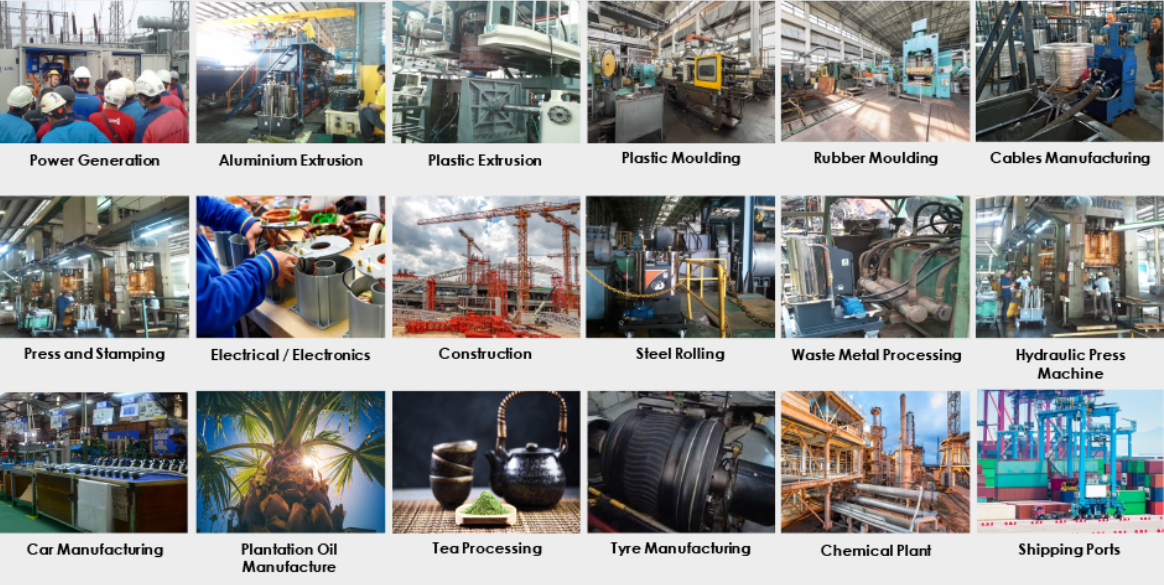 The industries ES served are very diversify, namely power generation industries, power distribution industries, railway, airline services, plastic moulding, aluminium extrusion, metal working, chemical, sea port, transport, rubber, cable, tire, oil refinery plant, automobile manufacturing, electrical and electronic industries. With the inclusive of their new range of product, Hydromaz Water Treatment System, ES extend their services to hotel and commercial complex.