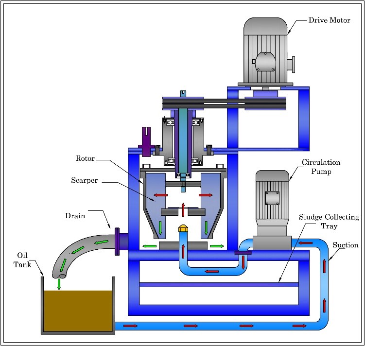 Used oil is pumped into the rotor by electric motor. Centrifugal force of 2000 gravity is created, causing the particles depositing on the inner wall of the rotor and form into dense cake of dirt (it is also known as sludge). Clean oil returns back to the oil tank. Dirt accumulated in the rotor is removed automatically by PLC control scraper provided in the rotor. Contamination collects in a tray below rotor and ready to be disposed.
